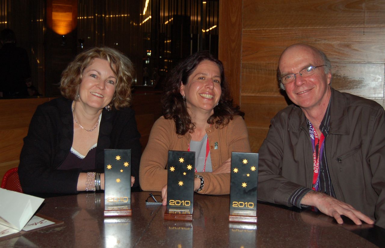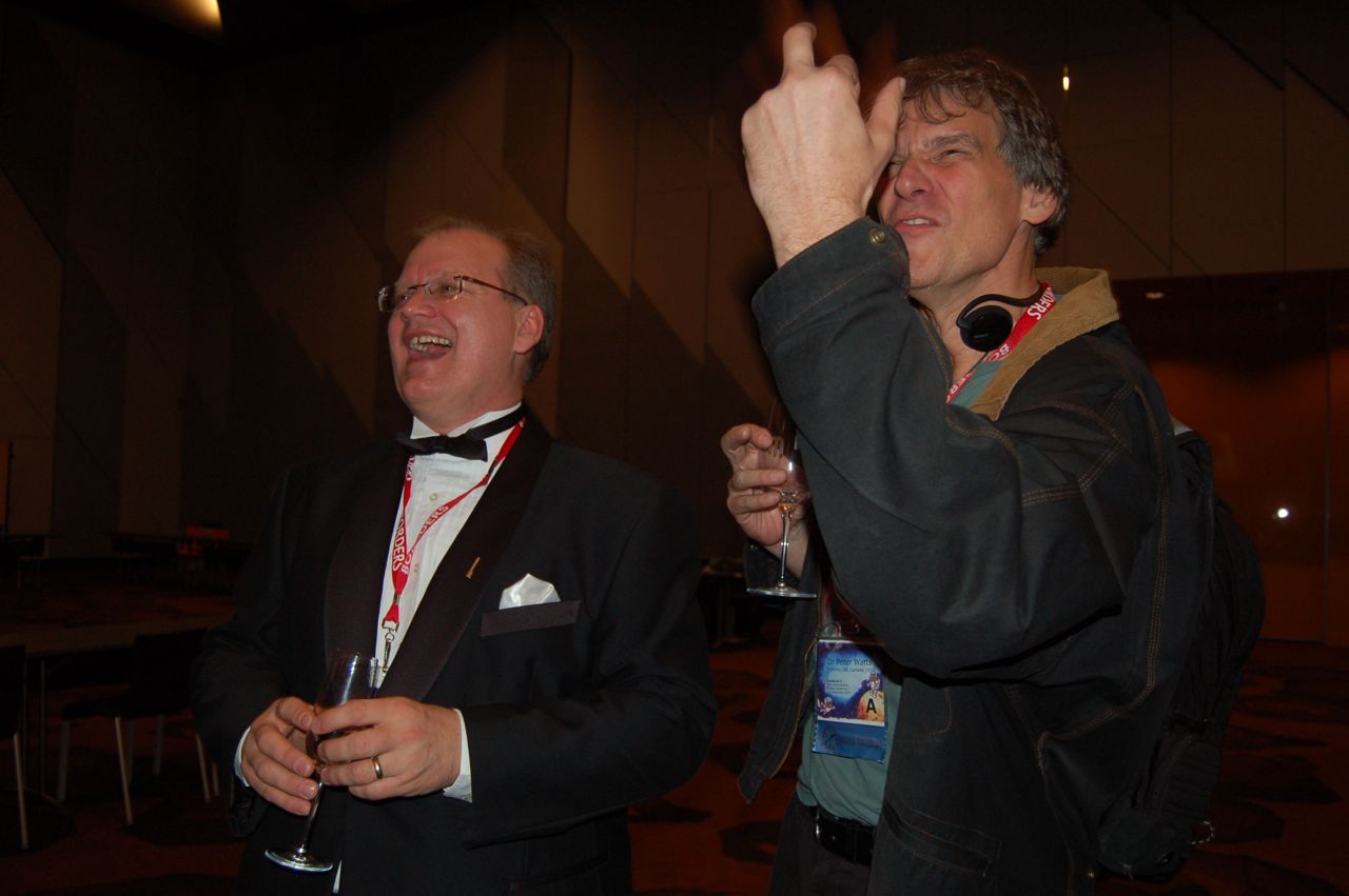 But you know what? I don’t care. I’ve got a fucking Hugo, and so do my new friends. The complete list is here, but Charlie took home the prize for Best Novella, China Meiville and Paolo Bacigalupi tied for Best Novel (China’s acceptance speech kicked ass with a scathing indictment of the illicit trade in Sea Monkeys), Clarkesworld and Starship Sofa (both venues in which is has been my privilege to appear) won for Best SemiPro and Best Fanzine respectively. Not to mention the fact that Cat won this year’s Ditmar for Best Short Story; Rob won for Best Fan Writer, Kaaron Warren (the muppet shapeshifter) for Best Novel (and I got to present that one) — and Janine Stinson from Michigan, whom I still have not met after a decade of pixelpaldom, co-won a Ditmar for Best Fan Publication.