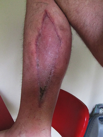 As it turned out, it wasn’t big enough. This is what my leg looked like a few hours later (and, for that matter, more or less what it looked like for the following month):