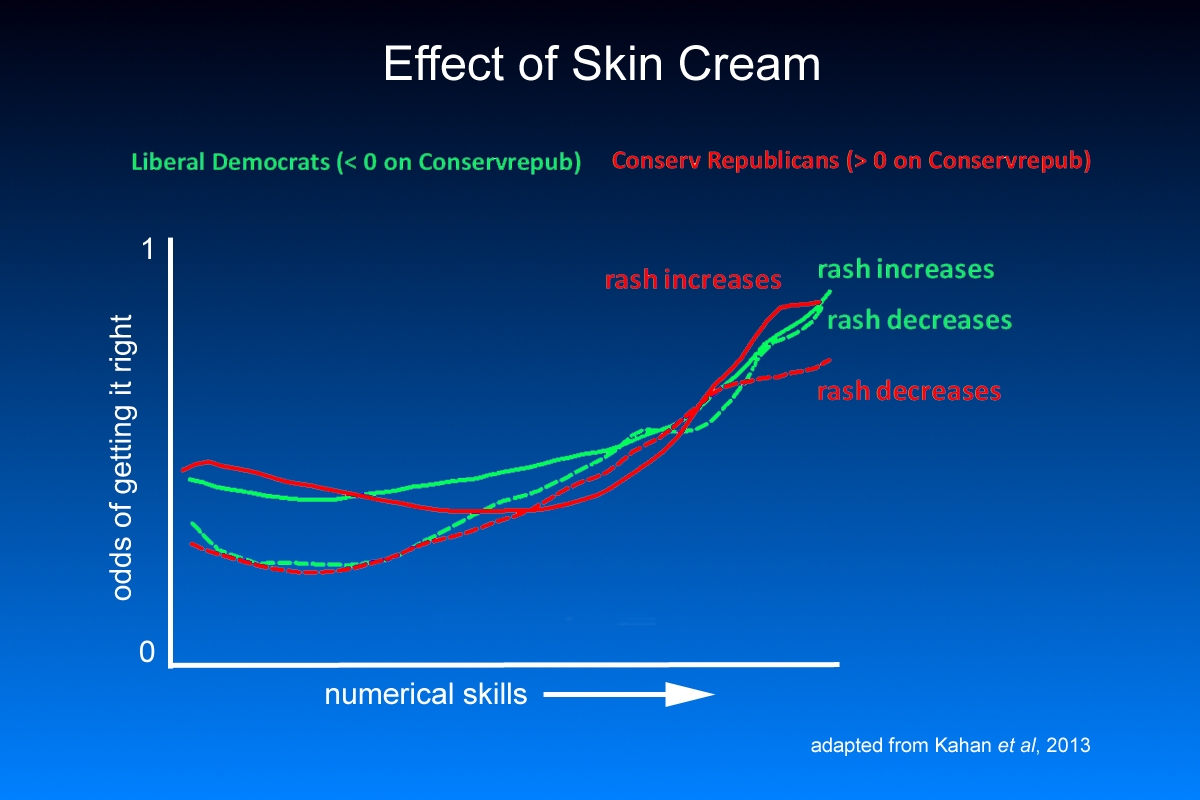 It relates to a 2013 study out of Yale by Dan Kahan et al, a study for which I conveniently happen to have some illustrative slides because I mentioned it in a recent talk at Concordia. Kahan et al showed data to over a thousand people— some right-wingers, some left, some statistically savvy, others functionally innumerate. Sometimes these data showed that a particular skin cream helped cure a rash; sometimes they showed the cream made the rash worse. Sometimes the data showed clearly that gun control reduced crime rate; other times, it showed the exact opposite.